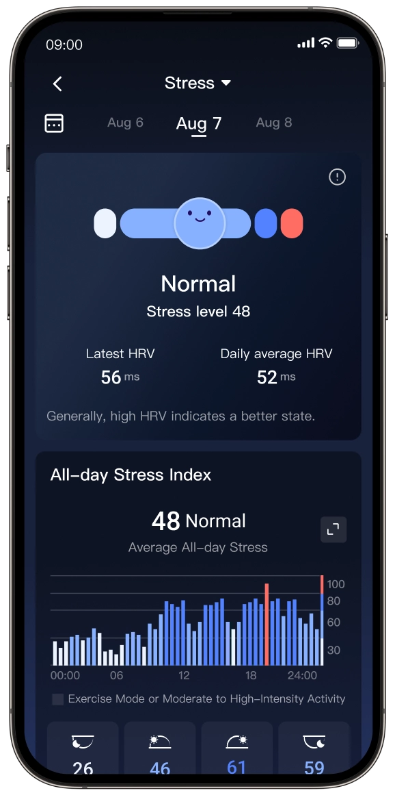 Stay aware of your Stress Score and trends in real time. See how your routines shape stress patterns and adjust before tension builds.